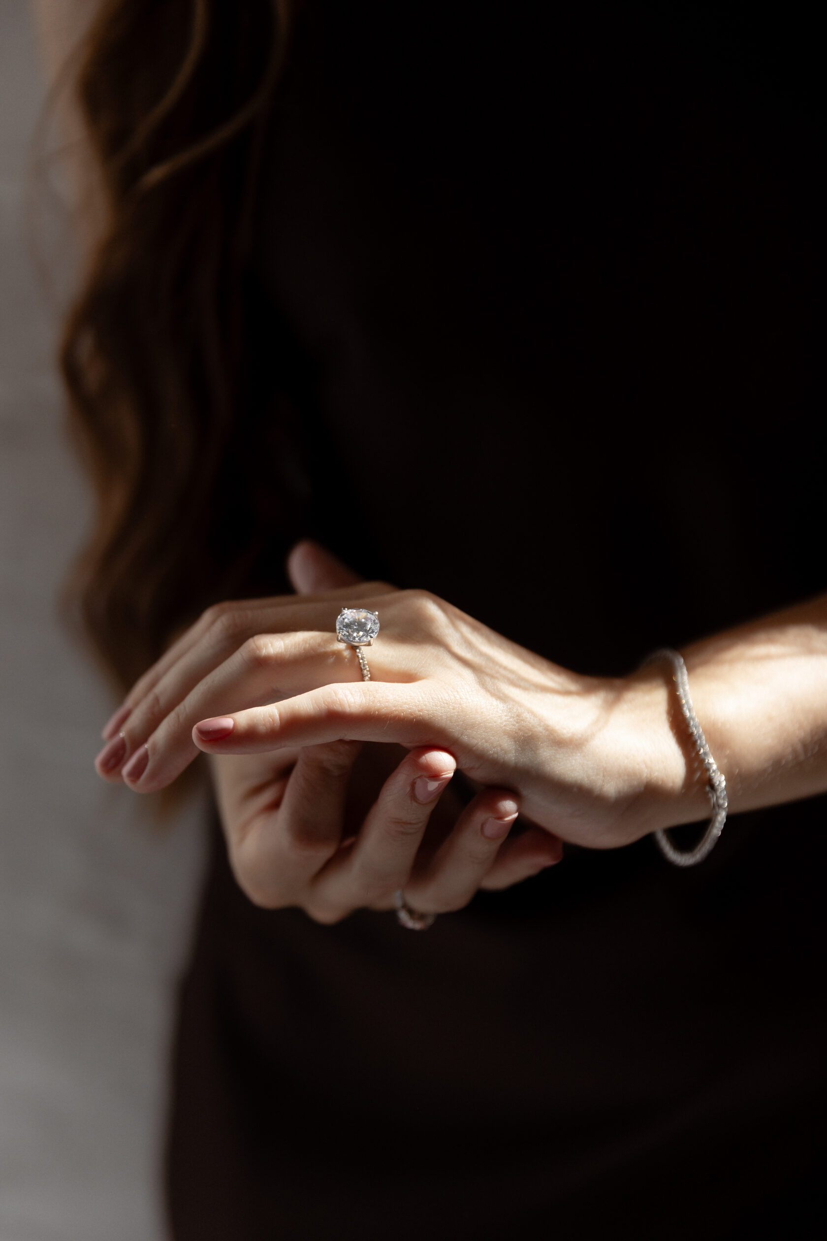Кушон, со своей мягкой «подушечной» огранкой, подчёркивает глубину цвета и делает сияние бриллианта более тёплым и объёмным. Такое кольцо будет дарить Вам радость и солнечное тепло в сверкающем блеске бриллиантов.